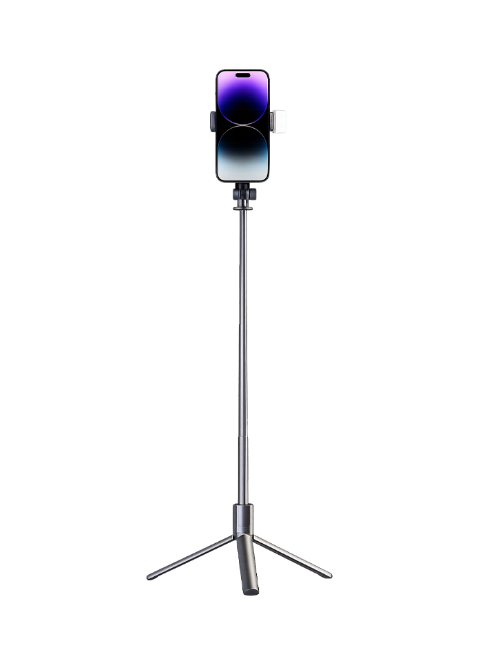 Trípode triangular multiuso con eje de acero inoxidable y un control remoto extraíble para manejo de cámara y video (límite de 15mts.) Además cuenta con una luz integrada y está disponible solo en color negro.
