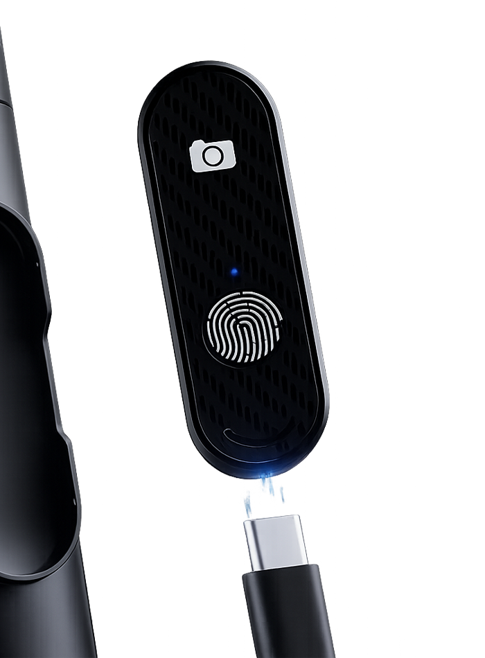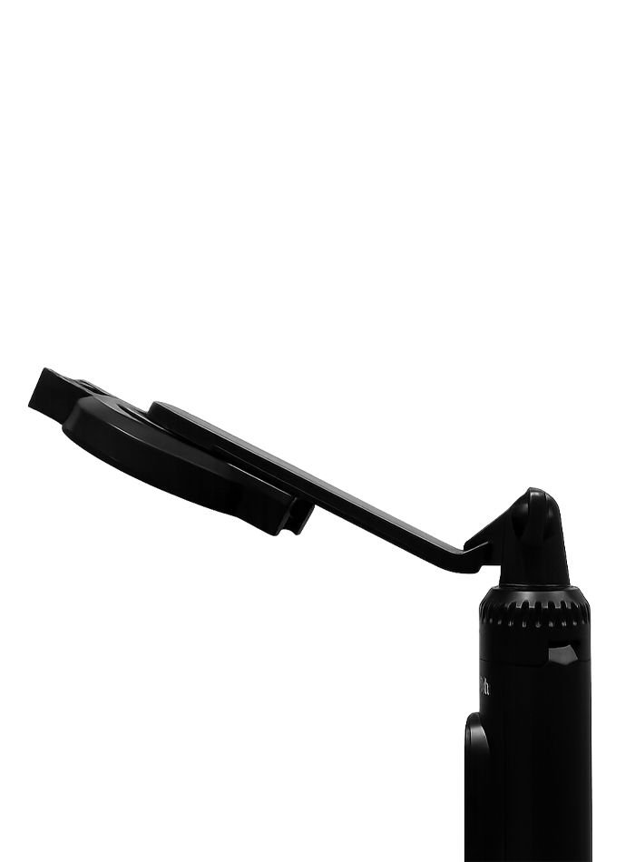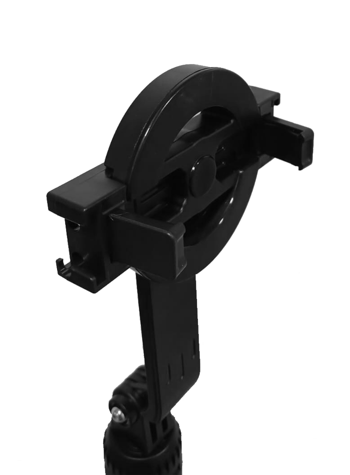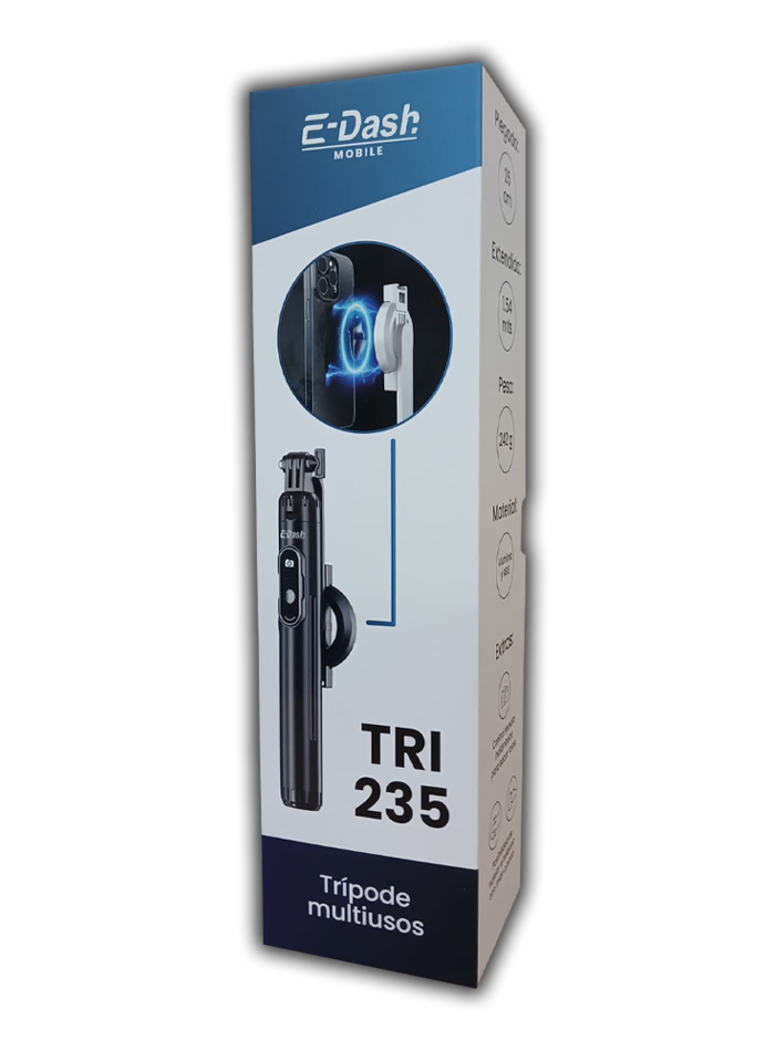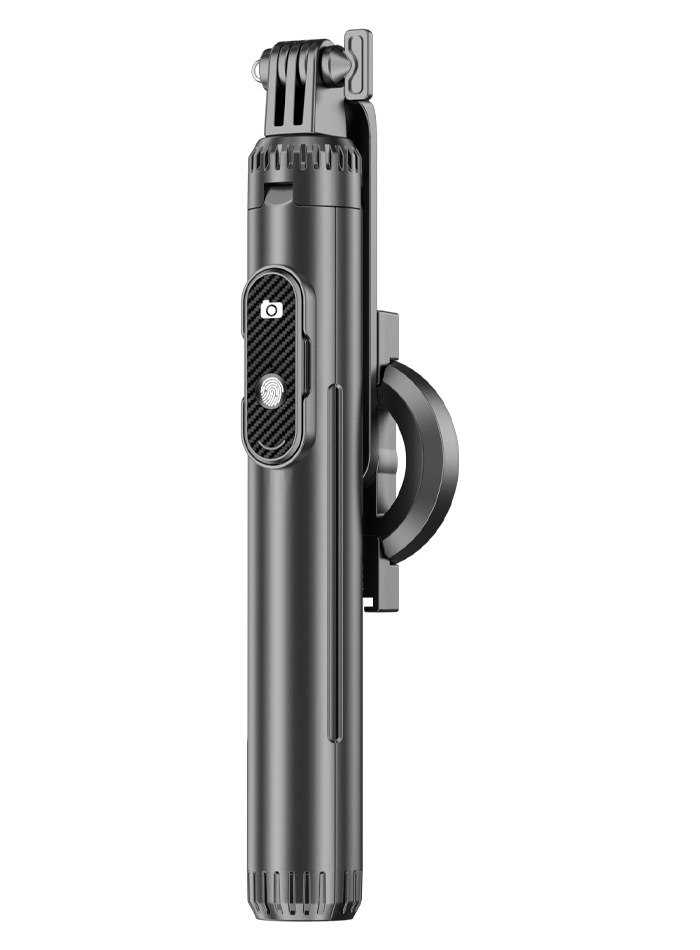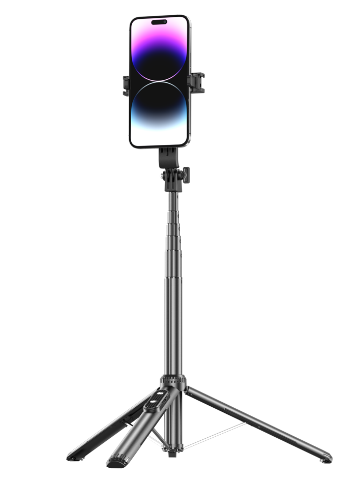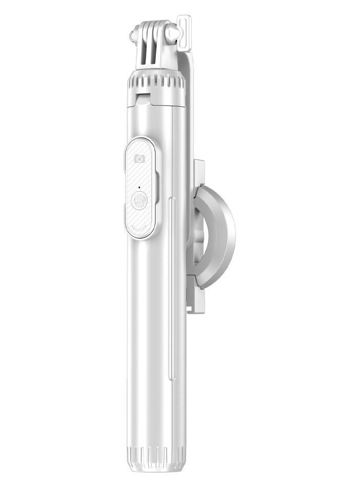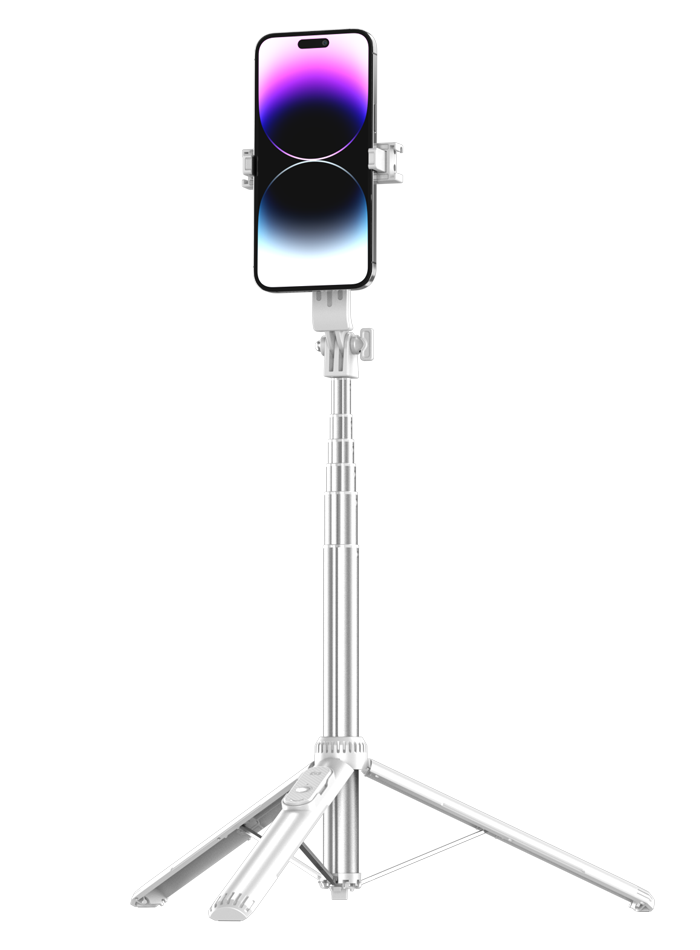 Trípode triangular multiuso de aluminio y ABS con control remoto extraíble para manejo de cámara y video que además cuenta con agarre magnético y la posibilidad de añadir 2 luces a sus lados. Disponible en blanco y negro.